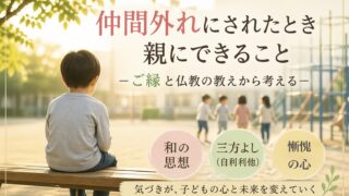 ☸️暮らしの中の仏教 仲間外れにされたとき、親としてどう向き合うか|仏教に学ぶ「ご縁」と人間関係 子どもが仲間外れにされたとき、親はどう向き合えばいいのか。実体験をもとに、対処法や声かけ、第三者の関わりの大切さを解説。仏教の「ご縁」や「自利利他」の考え方から、人間関係の本質にも触れます。 2026.04.22 ☸️暮らしの中の仏教子育てと仏教